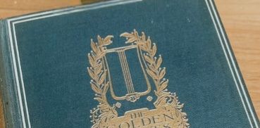 I can’t show you them. (I signed a library form, which said that I couldn’t share my photos on the internet.) But you can picture two small volumes, one dark green and one purple, a little over six inches tall, with gold-edged leaves, and a little gold-embossed lyre on the front cover of each. Slightly different in design, but very similar.