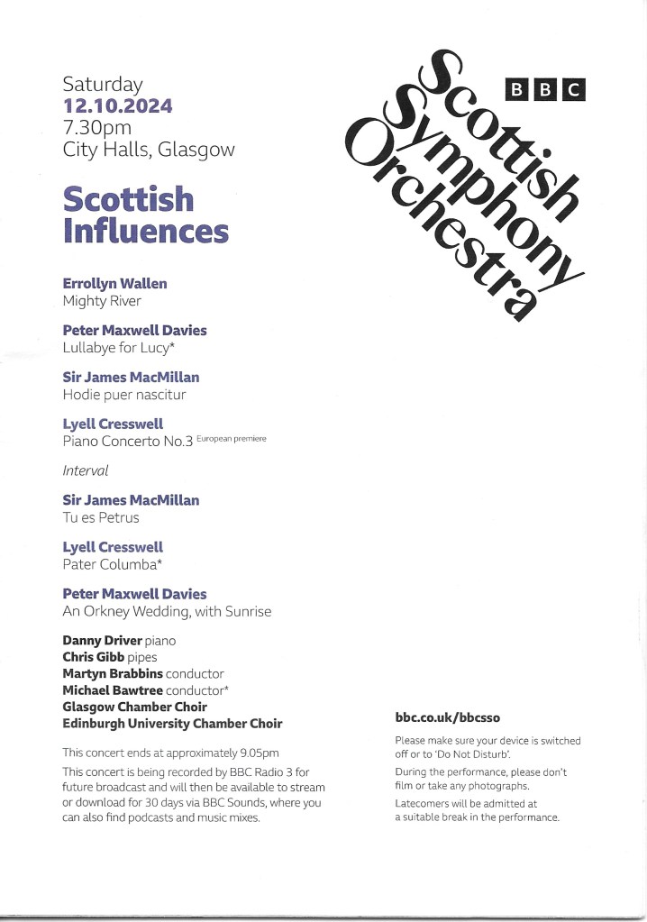 By way of a change, I took myself to the BBC Scottish Symphony Orchestra’s concert in Glasgow City Halls last night. Conducted by Martyn Brabbins and Michael Bawtree, the programme was entitled Scottish Influences, with music by Errollyn Wallen, Master of the King’s Music; Sir James MacMillan; and the late Peter Maxwell Davies and Lyell Cresswell. I anticipated seeing a few faces that I recognised – and I did – and I was particularly looking forward to hearing Wallen’s Mighty River and Maxwell Davies’ An Orkney Wedding, with Sunrise.