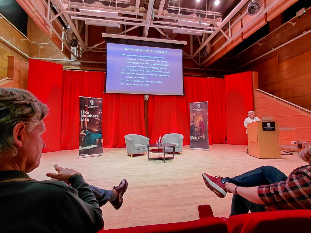 On a different note, yesterday (Tuesday) saw me as a delegate attending the first day of an Royal Conservatoire of Scotland conference, which was celebrating thirty years of traditional music at RCS. The keynote speaker was Dr Jo Miller, one of the co-founders of the Scottish Music degree. As she spoke, her slides showing the chronology of those early years, I realised that when I arrived at what was then RSAMD in 1988, this was just as trad music teaching was getting off the ground.