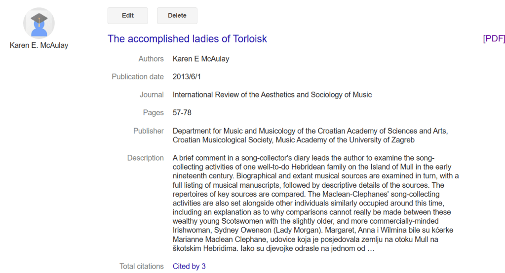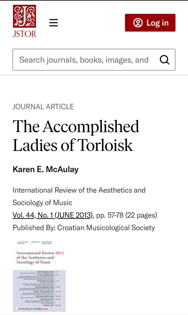Karen E. McAulay, ‘The Accomplished Ladies of Torloisk‘, International Review of the Aesthetics and Sociology of Music, Vol. 44, No. 1 (June 2013), 57-78