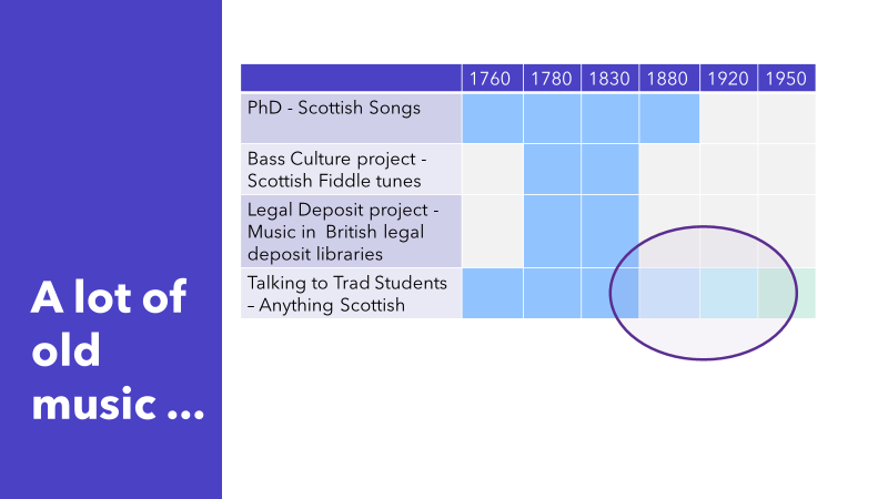First I had to explain my interest in research. I shared that, back in 2004, I decided to fund myself to study for a PhD, in my spare time.  (I had never finished the one I had once studied for in Exeter before I even trained to be a librarian. Believe me, it wouldn’t have been useful in the workplace. Cantus firmus treatment in fifteenth century English polyphony? Definitely only for mediaeval enthusiasts! I had started writing that first thesis, but think I lost interest partly for that very reason.) To keep myself interested, the new PhD topic had to be relevant to RCS, and my circumstances (a full-time working mum with three primary-school aged sons) meant the university had to be local. That’s how I ended up researching Scottish music at Glasgow Uni. I hoped the knowledge gained would be useful.