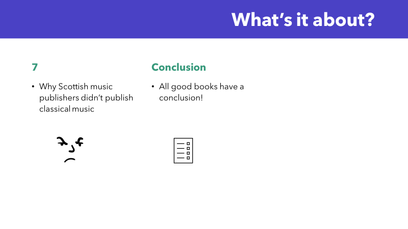 I described what the book is about. It begins by focusing on two Glasgow publishers (I may have mentioned the occasional woman publisher or RCS woman piano teacher … )
