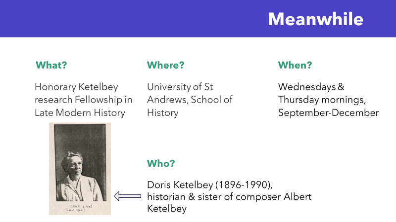 Hoping that my audience weren’t getting tired of the sound of my voice, I also mentioned that I’m about to take up a temporary honorary research fellowship at the University of St Andrews, in the School of History, from September to December. It’s the first Ketelbey Fellowship, named after the first woman history lecturer in St Andrews. Doris’s brother was an English composer – we have some of his music. I’ll be in St Andrews on Wednesdays and Thursdays, but still working back in RCS Whittaker Library the rest of the week. I anticipate editing the book, doing some more research, getting to know other scholars in the department, and I’ve been invited to give a couple of lectures – one in History and one in the Music department.