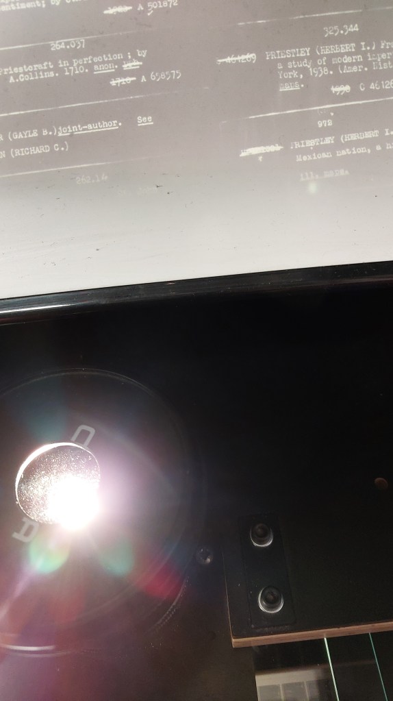 Then the microfiche reader screen was too high for my varifocals, so I had to stand to consult it; there was only just room and nowhere to plug in the laptop; and not enough room for my notebook unless I sat back down and balanced it on the edge of the table. I have never liked microfiches anyway! I disliked them in 1988 – nothing has changed.